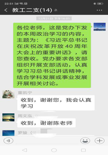2018年12月21日,按照betway西汉姆联官网党委统一要求,教工第二党支部召开学习“习近平总书记在庆祝改革开放40周年大会上的重要讲话精神”主题微信群在线学习交流会。支部全体党员教师参加了本次学习活动。