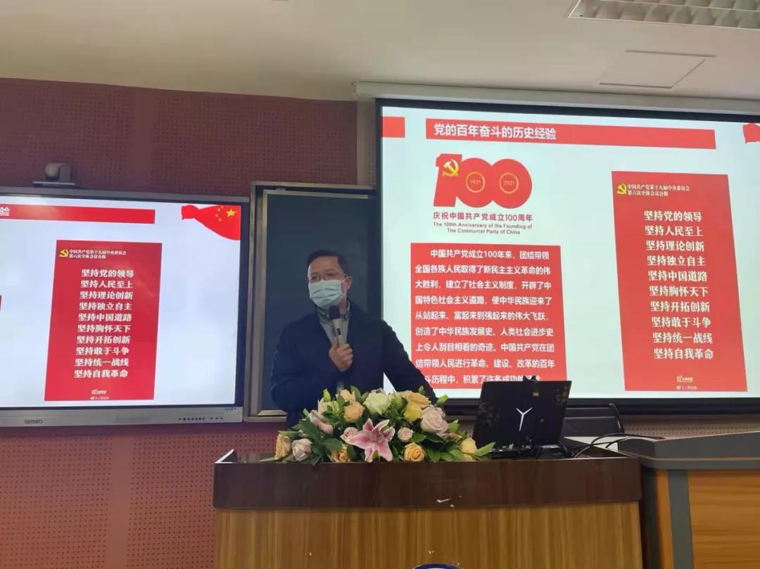 首先,杨磊老师以“伟大成就震铄古今,伟大经验垂范百世”为题,就中国共产党十九届六中全会精神进行了宣讲。杨磊老师对中央全会的会议概况以及党的十九届六中全会的主要议程进行了细致介绍。随后,他从党的百年奋斗的重大成就和党的百年奋斗的历史经验出发,对全会精神中有关社会发展的内容进行了深刻解读,着重分析了建党百年以来党团结带领全国各族人民顽强奋斗、勇毅前行的伟大历史实践,让同学们对全会精神有了更加深入的认识。最后,杨磊老师谈到十九届六中全会提出要“不忘初心实现第二个百年奋斗目标”,中国共产党处于新的赶考之路,在新的历史征程中同学们要不忘初心、勇于担当,做有责任感的新时代青年人。