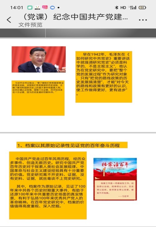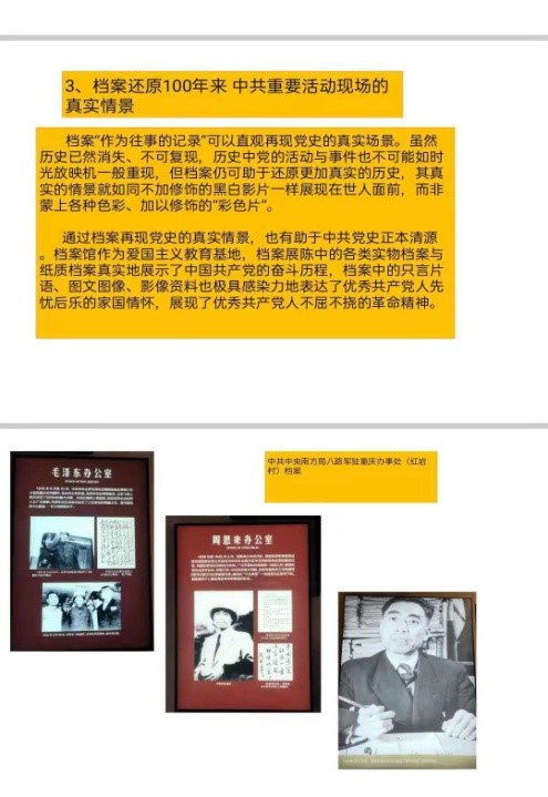 为庆祝中国共产党建党100周年,为使档案专业学生进一步了解红色档案在中国共产党发展历史记录中的重要价值,缅怀革命英烈的光辉事迹,教工二支部于2021年6月11日在四川大学江安校区一教D406教室组织档案学专业2019级和2020级本科学生进行了题为“红色基因彰显百年辉煌——档案学专业专题党课”学习。