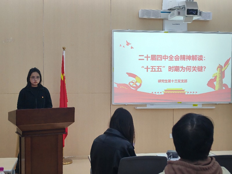 此次学习聚焦贯彻落实学校《关于做好党的二十届四中全会精神学习宣传的通知》要求,旨在准确把握全会的重大意义,深化对“十五五”时期历史方位、目标任务和战略部署的认识,引导党员增强“四个意识”、坚定“四个自信”、做到“两个维护”。学习依托视频《二十届四中全会精神解读:“十五五”时期为何关键?》,由中央党校(国家行政学院)经济学教研部教授黄锟进行系统讲解。视频从全会审议通过的《中共中央关于制定国民经济和社会发展第十五个五年规划的建议》切入,围绕“十五五”时期在实现2035年远景目标中的承前启后作用展开分析。学习结束后,支部党员围绕“十五五”时期发展任务、推动中国式现代化的责任担当等主题交流体会。大家表示,本次学习进一步深化了对全会精神的理解,将在今后理论学习和实践中持续加强全会精神的贯彻落实。