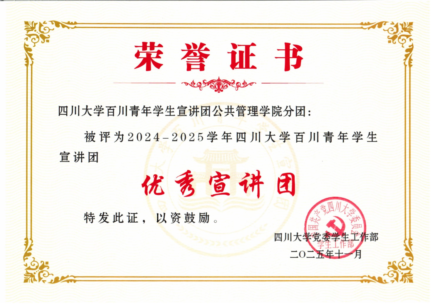 萃文喜讯 | 我院在四川大学百川青年学生宣讲团2025年表彰中荣获四项荣誉!