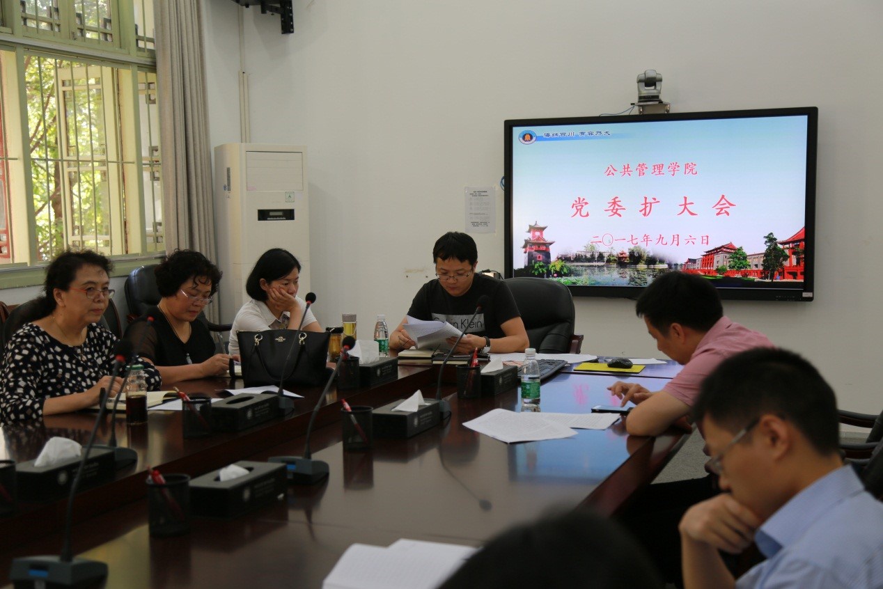2017年9月6日下午,betway西汉姆联官网于311会议室召开党委扩大会,学习贯彻习近平总书记重要讲话精神。会议由学院党委书记姜晓萍同志主持,学院中层领导干部、党委委员、工会主席、党政办主任、团委书记及各党支部书记参加了此次会议。