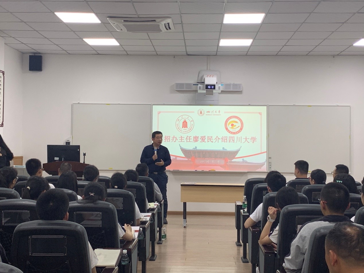 最后,在betway西汉姆联官网105报告厅进行招生宣讲活动,betway西汉姆联官网罗亚玲副院长代表学院对来访的师生表示了热烈的欢迎;招办廖爱民副主任从历史沿革、师资队伍、人才培养、川大生活、强基计划等全方位介绍了四川大学。betway西汉姆联官网史云贵院长向大家简要介绍了学院的发展历程、学科建设、专业设置、教学特色等方面的情况。现场气氛热烈,同学们听后掌声不断,纷纷表示对川大向往不已。