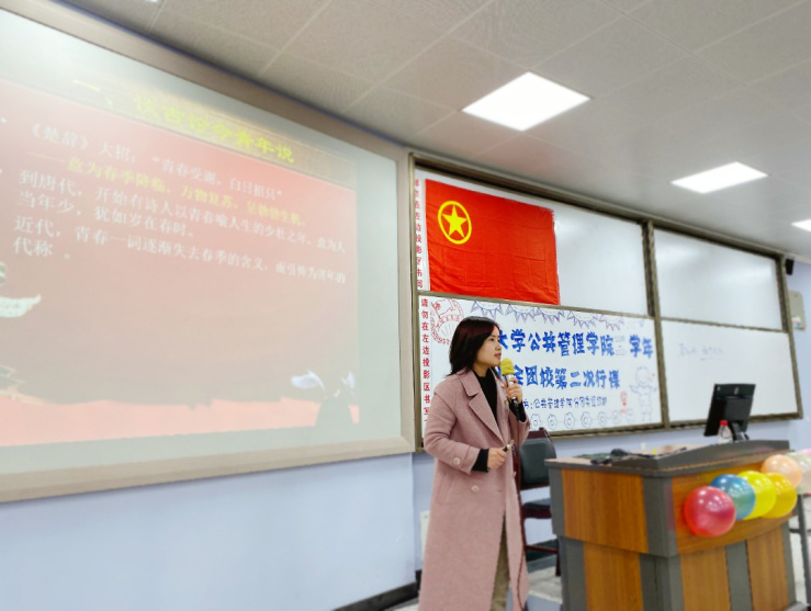 青杨媚老师就“历史中的中国共青团”与同学们展开了交流。青老师首先从古今中外典故中关于“青春”与“青年”的解读,分析了“青年“与“青春”的关系。接着,青老师带领同学们从历史发展的维度了解了中国共青团的起源、组织性质的变动和组织名称的演变。同学们通过历史影像和珍贵画面,深切感受到了共青团诞生初期筚路蓝缕、艰辛不易。中国共青团一直是党的后备军,是为党的事业培养合格建设者,向党输送新鲜血液,向党输送新生力量的重要组织。最后,青老师和全体同学一起展望了新时代的中国共青团,团组织正朝气蓬勃,阔步向前。