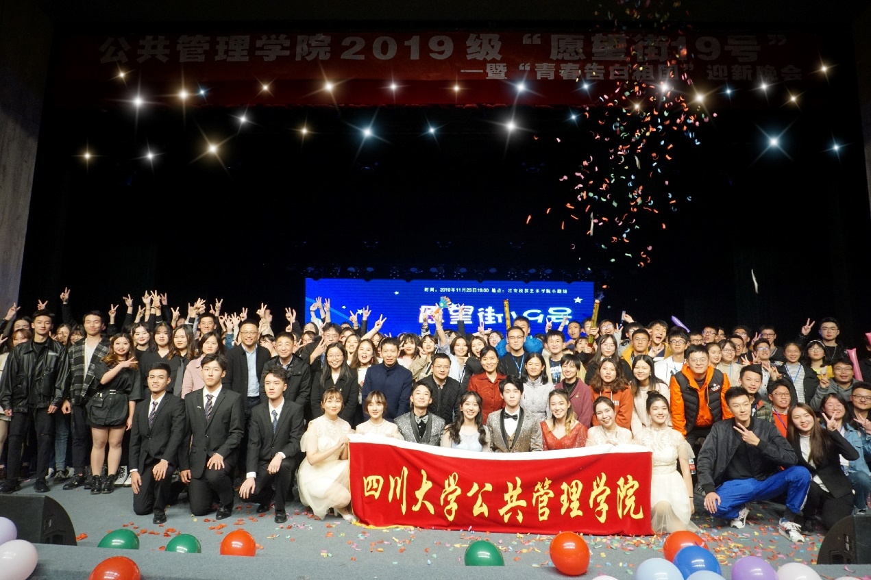 2019年11月23日19:00至21:30,betway西汉姆联官网“愿望街19号”迎新晚会于江安校区艺术学院小剧场成功举办。学院党委副书记兼纪委书记杨磊老师、副院长罗亚玲副教授、教导员许吟雪老师、行政管理系主任范逢春教授、劳动与社会保障系主任蒲晓红教授,社会学与应用心理学系马缨教授、党政办主任林茂松老师、团委书记兼2017级研究生辅导员青杨媚老师、学生科科长兼2016级本科辅导员陈萱源老师、2017级本科辅导员周锐老师、2018级本科辅导员刘晓燕老师、2019级本科辅导员刘碧老师等作为嘉宾观看了晚会。