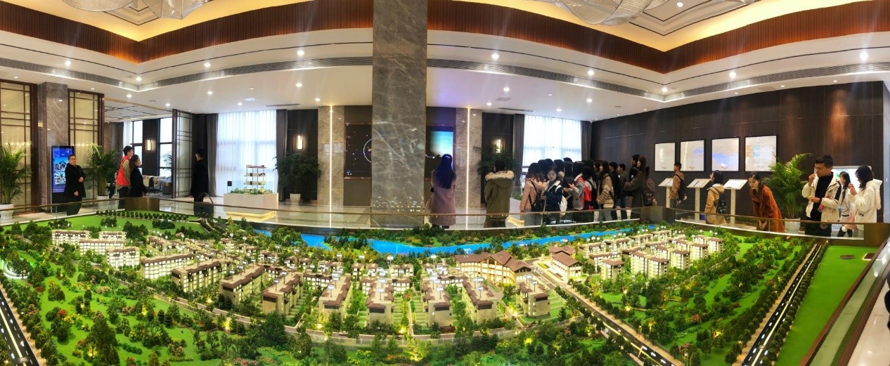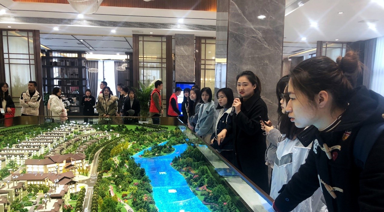 第二部分为参观项目售楼部,从营销方面了解房地产项目管理知识。售楼部负责人从牧山溪岸项目基本情况、周边配套设施、市场营销等方面对项目进行了详细介绍,并对同学们的问题进行了一一解答。