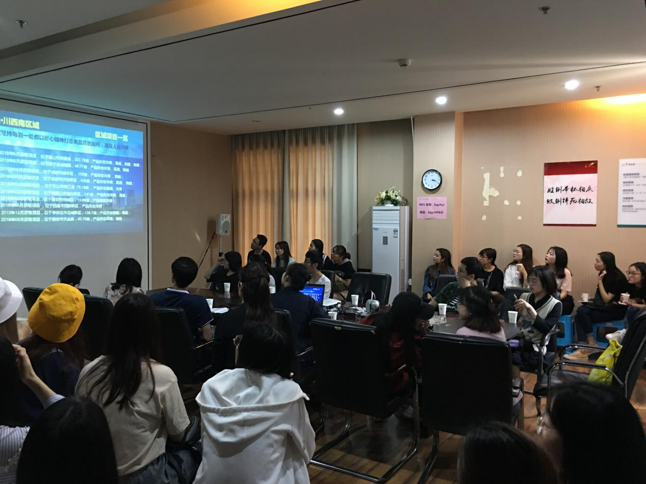 课程实践的第二部分为座谈会。在碧桂园海昌天澜售楼部二楼会议室,项目的销售主管、投资部经理、营销策划部经理和人力资源部负责人以PPT的形式向大家介绍了整个海昌天澜项目的总体情况以及碧桂园公司发展情况及其在西南地区的发展战略。随后师生们对海昌天澜项目营销手段和房地产投资策划等方面提出了问题,各部门负责人通过生活中的具体实例、工作经历等介绍来帮助同学们理解。