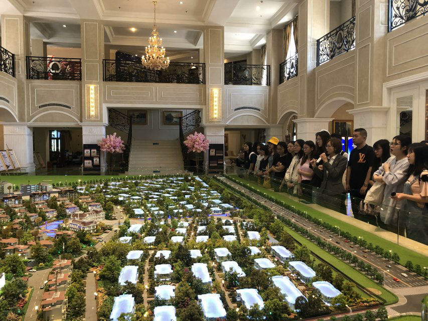 本次课程实践分为两部分,第一部分为项目总体介绍以及样板间参观。首先项目销售主管总体介绍了海昌天澜项目基本情况,包括项目区位条件、产品定位、产品设计以及销售情况等内容。之后在海昌天澜销售顾问的带领下,全体师生先后参观了两间样板别墅。在参观过程中,同学们的兴趣都很高,在楼层之间来回穿梭,仔细分析产品差异以及影响因素。同时也认真地听着销售顾问讲解相关基本信息,并与顾问积极进行交流。