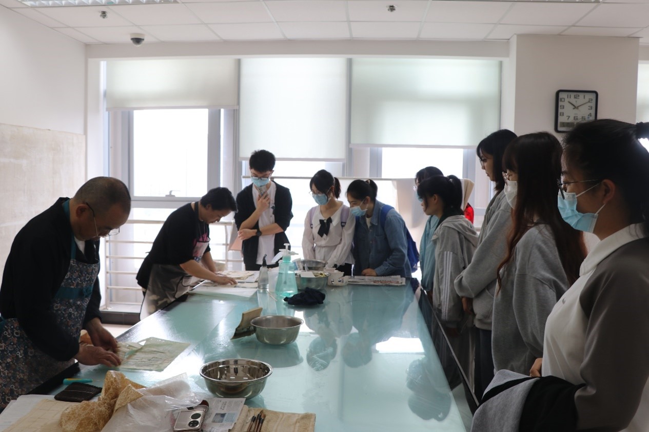 首先,成都市档案馆档案修裱室、档案仿真复制室的老师们先后为同学们详细讲解了档案修裱、档案仿真复制涉及的相关知识、修复工具、设备、方法、技巧和注意事项,并进行了修裱和仿真复制全过程地演示。