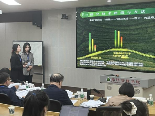 答辩流程包括学生汇报和老师点评提问两部分。各学生围绕土地碳效应、城镇用地扩张和土地利用效益评价等诸多土管领域研究热点,从研究背景与意义、国内外研究现状、主要研究内容、研究方法与思路、研究进度安排等方面依次开展陈述,各答辩组老师则秉持严谨认真的治学态度,对答辩学生开题报告进行点评和提问,并提出具体、中肯的意见建议。整个答辩过程时间安排合理紧凑、气氛张弛有度。