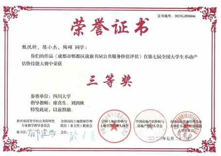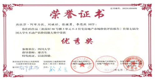 我院2020级土地资源管理专业本科生甄悦昕、陈小杰、陶硕凭借《成都市郫都区战旗书屋公共服务价值评估》估价报告获得三等奖。热依莎·阿布力孜、刘婕妤、张建勇和李思然凭借《新南村50号楼3单元5-2住宅房地产市场价值评估报告》获得优胜奖。