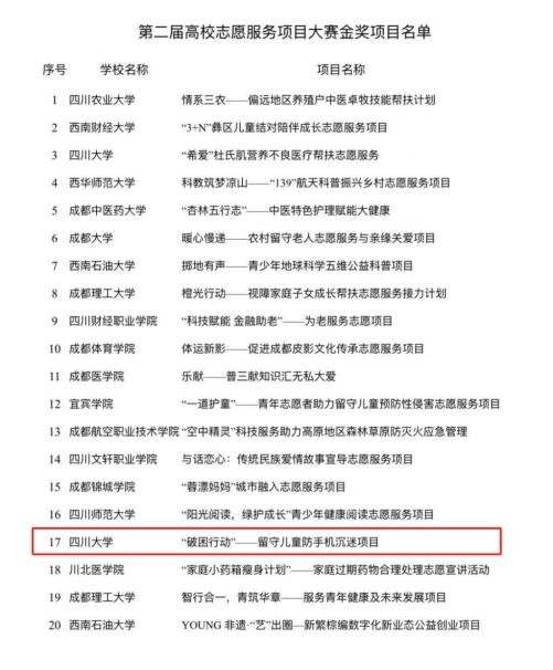 10月26日至27日,第二届四川省高校志愿服务项目大赛在四川宜宾举行,我院学生牵头组队的《“破困行动”——留守儿童防手机沉迷》创意项目在本次大赛中斩获金奖。赛事由共青团四川省委、中共四川省委教育工作委员会、四川省精神文明建设办、四川省民政厅、四川省科学技术协会共同主办,四川青年志愿者协会等组织共同承办。团队成员包括2021级社会工作专业本科生潘奕成、2021级行政管理专业本科生申羽茜、2021级行政管理专业本科生傅珏华、2022级公共管理大类专业本科生张晶涵以及两名艺术学院学生。