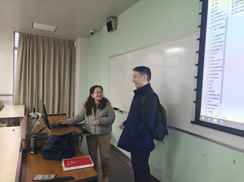 范逢春副院长课前与任课教师沟通,课程:文书学,教师:王萍