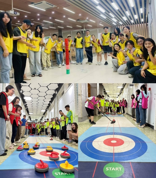 在合力筑塔游戏中,各队师生充分沟通,发挥团队力量,快速高效地完成了八块“塔层”的搭建任务,师生们每一次调整积木的角度,都加深了彼此间的信任。旱地冰壶游戏更是将此次活动推上了高潮,冰壶在赛道滑行、碰撞,牵动全场目光,围观的队员热情高涨,助威声不断。