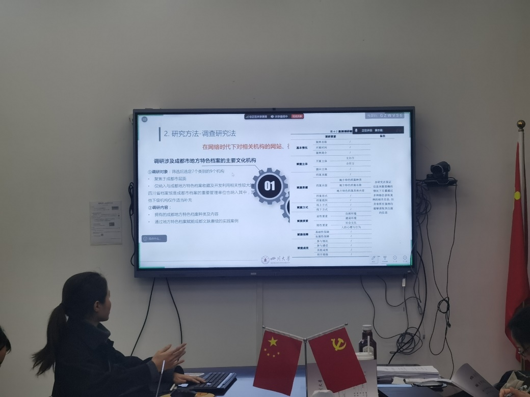 1月10日下午,我院2022级档案学专业硕士研究生毕业论文预答辩在萃文楼220会议室举行。秘书档案学系王萍教授、史江教授、蔡娜副教授、赵跃副研究员以及王阿陶副研究员共同担任此次预答辩的评议专家,为同学们的论文提供宝贵的指导和建议。2022级档案学专业硕士研究生依序进行预答辩,部分2023级与2024级研究生到场旁听,观摩学习并汲取经验。