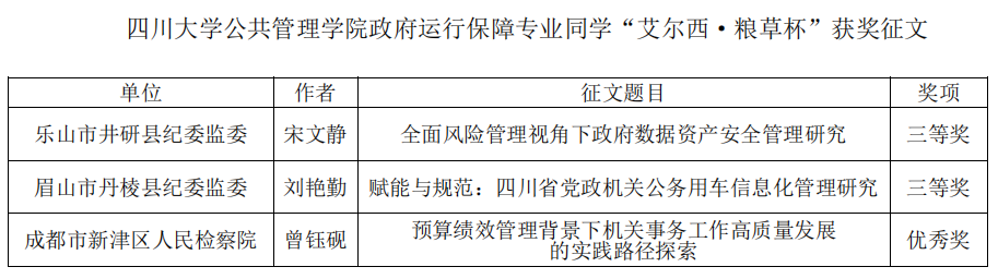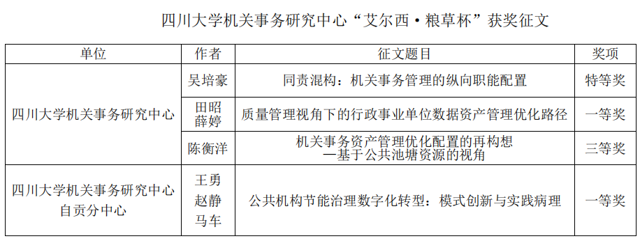 近日,由四川省机关事务管理研究会举办的第二届“艾尔西·粮草杯”征文比赛结果公布,我中心在机关事务理论研究领域再创佳绩!此次征文比赛,我中心推荐报送的理论研究文章荣获特等奖1项,一等奖2项,三等奖1项!相关荣誉不仅彰显了我中心在理论研究领域的深厚底蕴和创新能力,同时也为我们在理论研究领域的持续深耕和精进提出了更高的要求。