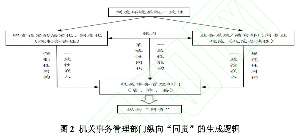 对机关事务管理相关的法律法规和制度文件进行梳理,可以发现,2008 年颁布的《公共机构节能条例》明确规定管理机关事务工作的机构负责本级公共机构的节能监督管理工作。而 2012 年出台的《机关事务管理条例》则规定机关事务主管部门在经费管理、资产管理和服务管理三大类职责上的具体内容,包括制定实物定额和服务标准、制定和组织实施机关资产管理的具体制度、统筹安排机关用地、制定统一的机关后勤服务管理制度、确定机关后勤服务项目和标准、加强对本级政府各部门后勤服务工作的指导和监督等。然而,经过仔细对比和分析,追求规制合法性的强制性同构并不能完全解释机关事务管理部门纵向“同责”。一是并未涵盖办公用房管理、公务用车管理等重要职责领域;二是难以解答为何法规赋予经费管理职责,但省、市、县却难以履行。这表明,除了追求规制合法性的强制性同构外,还有其他因素影响着机关事务管理部门纵向“同责”。